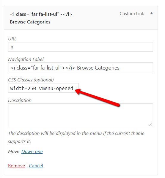 if you don’t have css Classes field, click on top right corner « Screen options » and enable css class field there